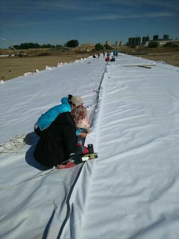 鋪設(shè)現(xiàn)場進(jìn)入人員不得穿釘芏、高跟鞋及硬底鞋,開始做業(yè)后,嚴(yán)禁在可能危害土工膜的范圍內(nèi)進(jìn)行交叉作業(yè),同時(shí)避免火源。具體施工中應(yīng)該注意以下幾點(diǎn):清除鋪設(shè)范圍支持層的各種錐形、尖棱雜物;每天土工膜展開的數(shù)量不得超過焊接范圍;鋪設(shè)時(shí)應(yīng)該考慮到材料的熱脹冷縮導(dǎo)致的尺寸變化,預(yù)留出一定的伸縮量,且應(yīng)避開夏季中午高溫時(shí)段。所有外露的土工膜邊緣須用砂舊輪胎等物壓載物壓覆,避免被風(fēng)吹起;
